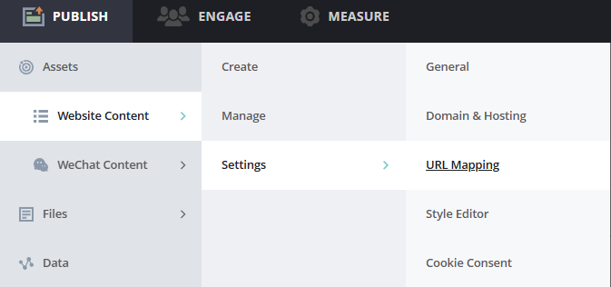 Click PUBLISH on the top menu bar. A popup window displays. Click Website Content > Settings > URL Mapping.