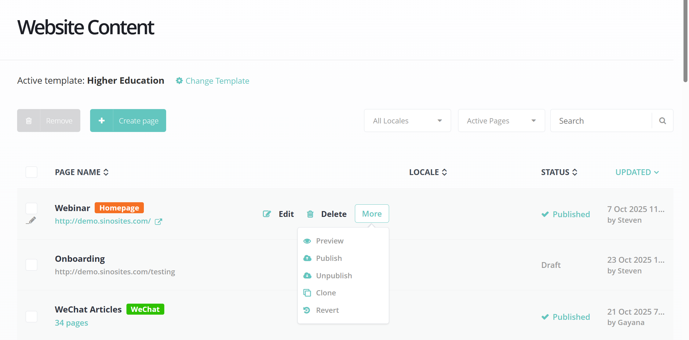 The design and functionality of the Edit Content area and Website Content area are the same for custom builds and templates.