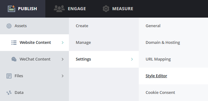 Click PUBLISH on the top menu bar. A popup window displays. Click Website Content > Settings > Style Editor.